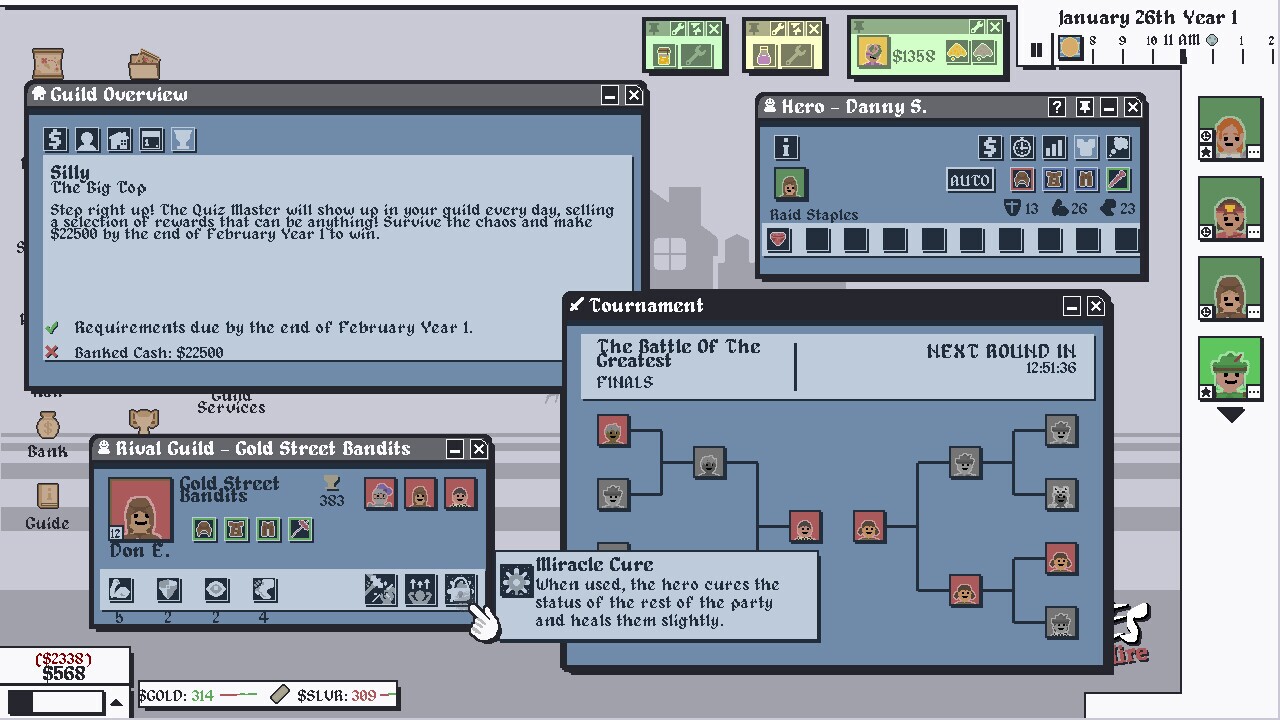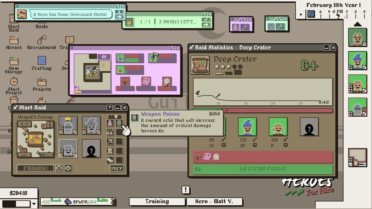 Heroes For Hire is an incremental business management game focused around building a dungeon raiding guild from the bottom up with the GuildOS system. Managing a guild is just easy as it sounds like, too. I mean, when running any business, you just have to worry about your employees, your customers, your finances and your living quarters. What could possibly go wrong when you start bringing dungeons, fantasy and magic into the picture, too?Think you have what it takes to run the number one guild in the county? If so, you can compete in tournaments and competitions with rival guilds to determine who really is Raiders Digest's top guild of the week!Employees are the life blood of any business. After all, how are you going to raid dungeons when you don't have any dungeon raiders on the payroll?Recruit and manage a team of heroes with their set of skills, personality and stats to help them during raids and tournaments. Craft, buy and find equipment and weaponry that can tie-in roles and niches for the team and guild. Make sure to keep the needs of your employees well met by adjusting their wages, schedule and living quarters.Set up your heroes with the best equipment and items you can find, and go and let them explore some dungeons on their own when they're ready!Make and upgrade your heroes' equipment using materials scavenged in raids and on gathering missions. Craft the necessary tools needed to help your heroes out on their adventures, such as potions and bombs. Build the furniture needed to turn your guild from a shack to a castle fit for a hero of any calibre. Of course, there's more to running a guild than just the heroes and finances—there's the guild itself, too! Expand your guild's living quarters with furniture that has been bought, found and crafted. Raise your guild's reputation to attract more guest merchants and services with stringent housing requirements. Build more rooms to improve the quality of life for your heroes, and unlock some upgrades at the same time. Remember, there's always room to grow and expand your guild! So...