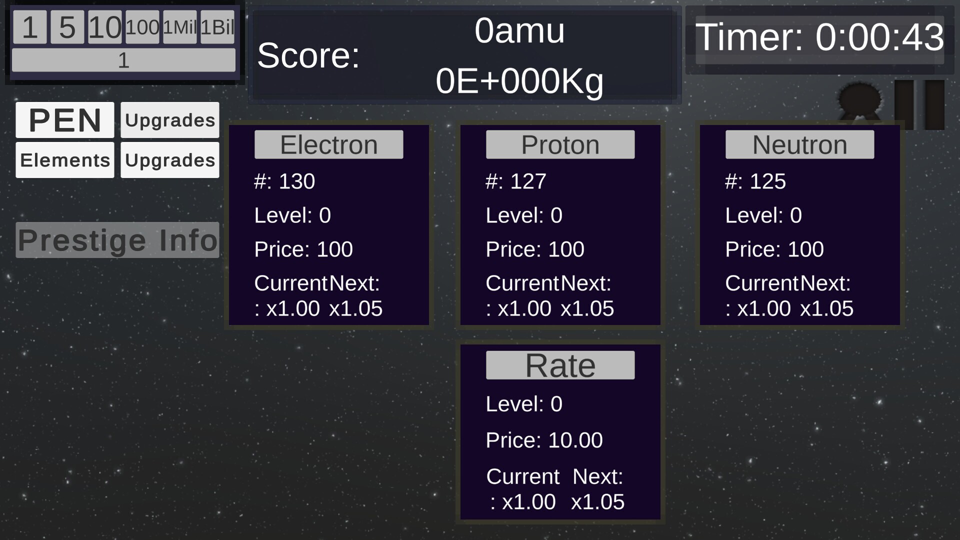 In this game, you will be aiming to create a universe with the same mass as our own. This can be achieved in many ways. From creating the universe from just 1 element, to creating it out of an equal amount of all the elements.You will start off with just 1 Electron, 1 Proton and 1 Neutron. From there you must increase your rate of production of these Sub-Atomic Particles.Once you have enough to create Elements, you can open the Periodic Table and choose which atom to create. The Atomic Mass of this atom will contribute to your score.Because the Universe is made up of a super large number of atoms (that I will not spoil here), you will be able to buy in bulk. But this system works slightly different. Here, each button you press multiplies how many you can buy. So pressing 5 twice will allow you to buy in bulks of 25.You will also be able to upgrade all the Elements and Sub-Atomic Particles to increase their mass.However, this may seem a bit slow after a while, so Prestiging will give you an opportunity to reset and start over. This time though, you will have a multiplier for your Rate of production for your Sub-Atomic Particles. This will massively speed up your progress.Your time and score will also be submitted to leaderboards so you can compare who has the current highest mass and who managed to create the universe in the quickest time.There will also be many achievements along the way. From creating a molecule of water, to recreating the Universe as close as possible.