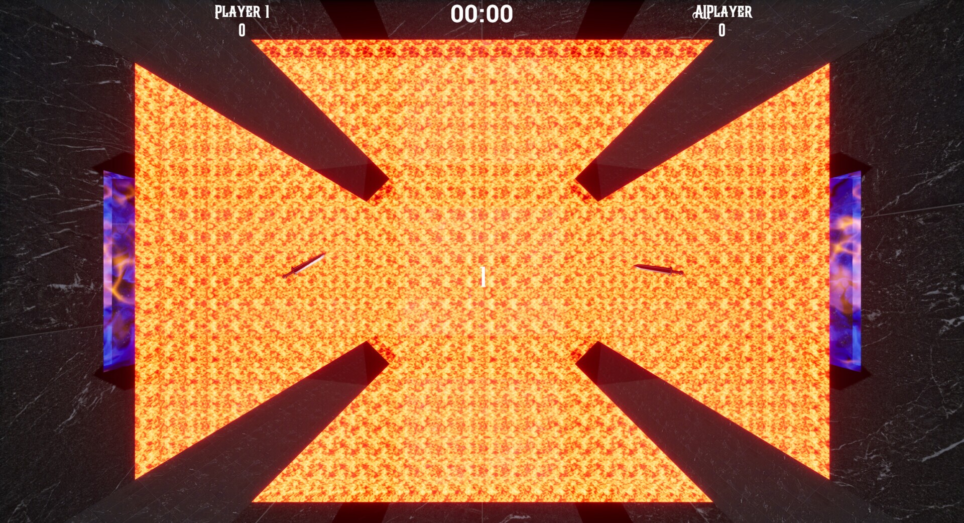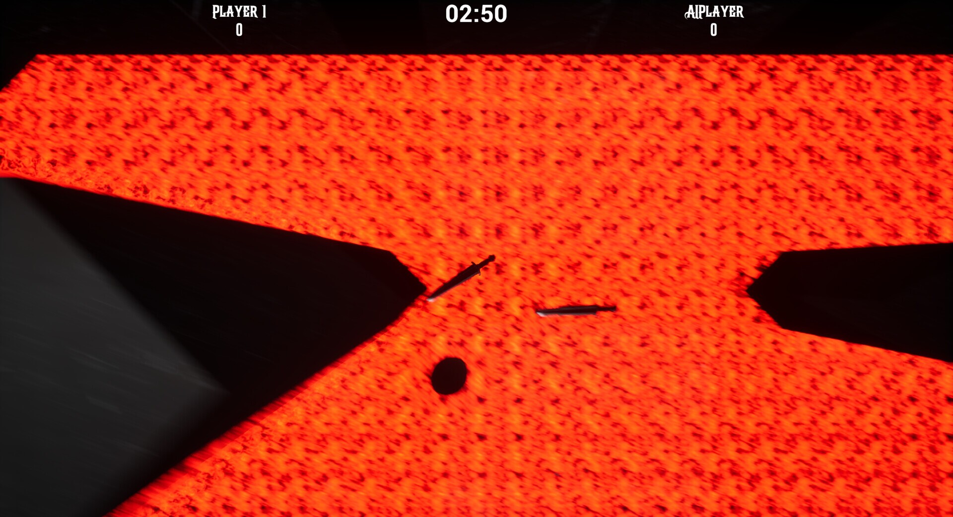 A simple passion project from a solo developer. Inspired by air hockey, this game is a 3D top-down game where you control a slippery floating sword guided solely by your mouse. Like air hockey, you and your opponent compete to strike a puck into your opponent's net while defending your own. However, unlike air hockey, this game allows you to glide across the entire arena (not just your side) and strike your opponent's weapon as well as the puck. The swords can be difficult to control, much less the puck, so make sure to guide them with precision using your mouse. After 3 minutes, the player with the most goals wins, unless there is a tie, in which case, Sudden Death begins, and the next goal becomes the winning one. Play against your friends or AI in this simple 1v1 air-hockey-style game.