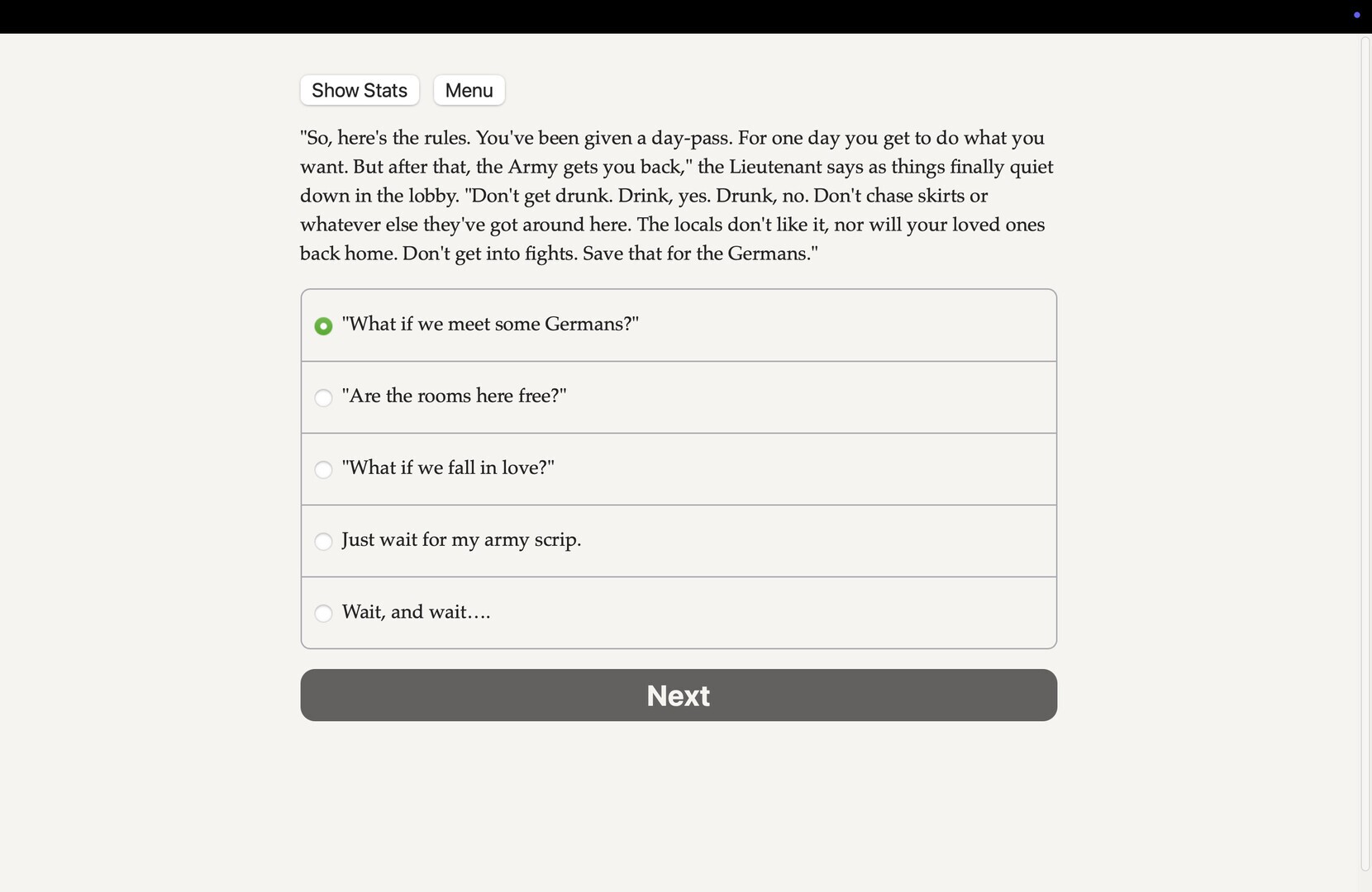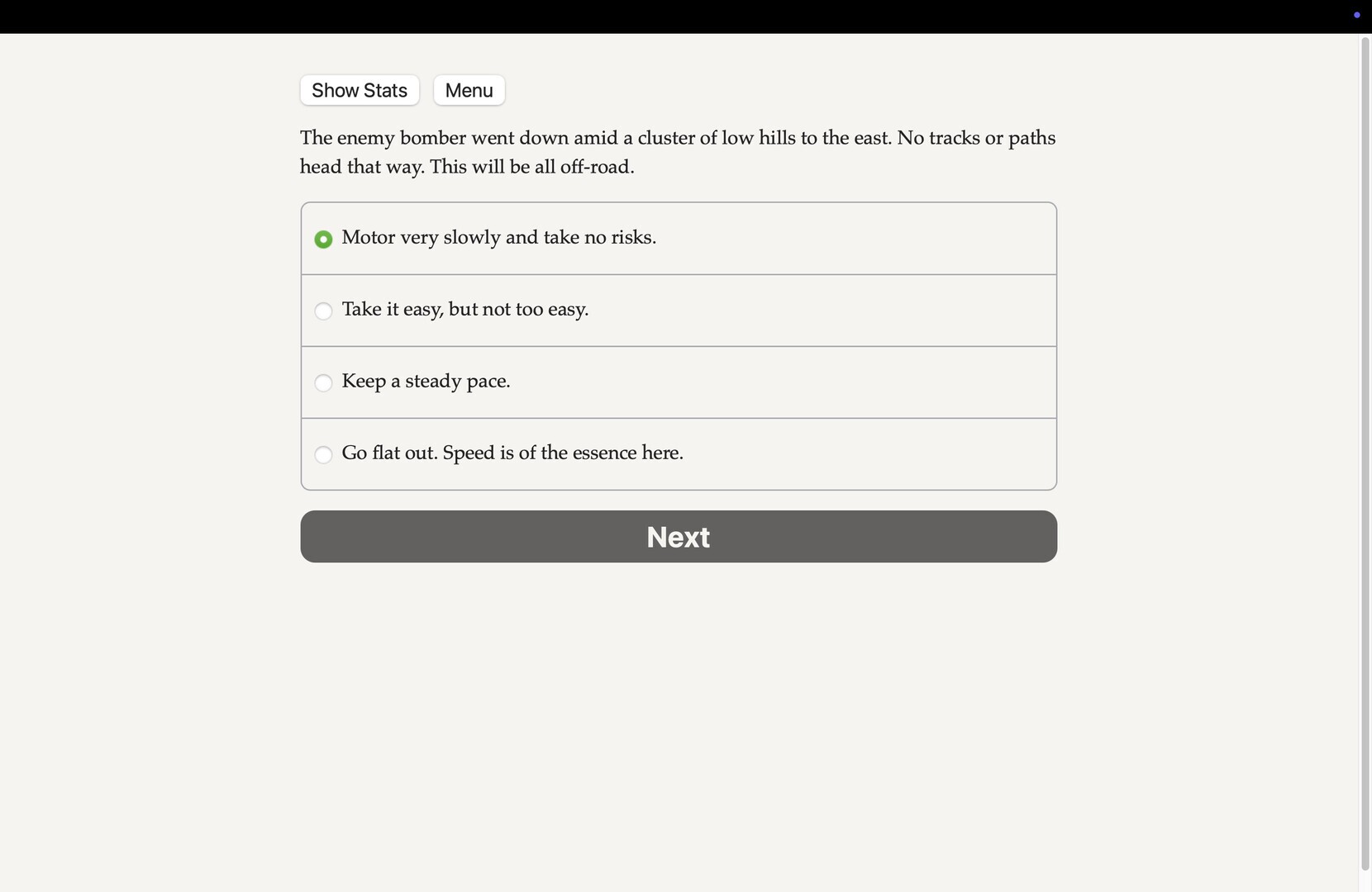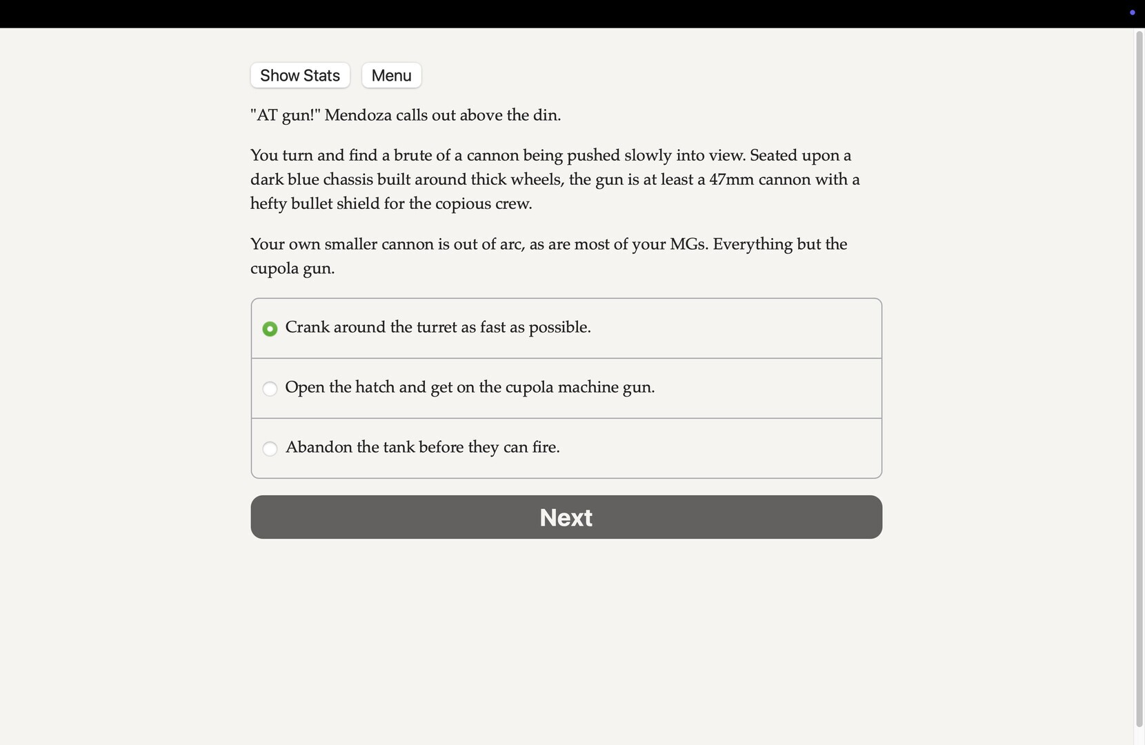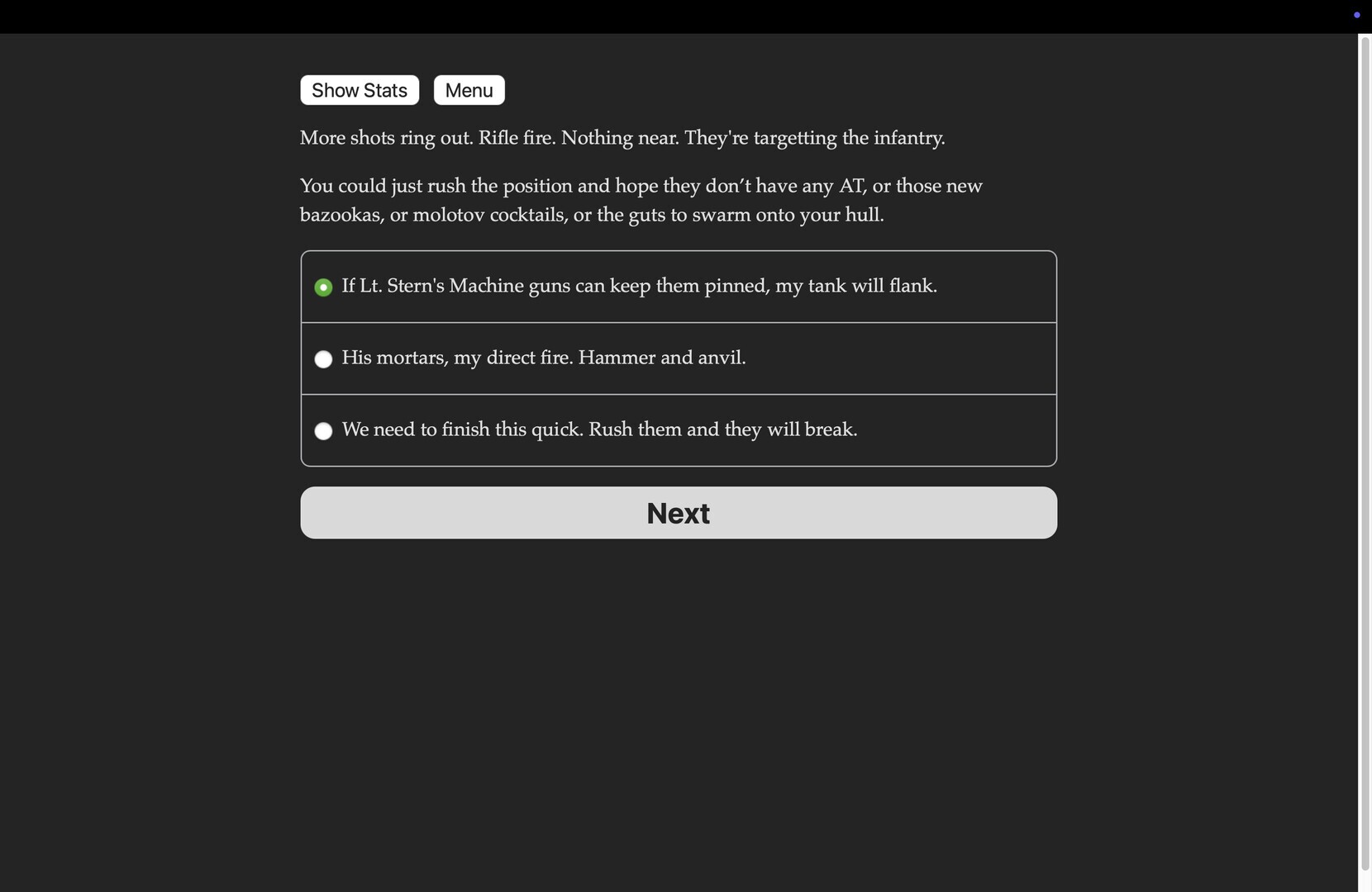 Take the commander’s seat of an American tank. Plunge into the deserts of North Africa. Every decision counts as you battle Nazis, master logistics, and strive to keep your crew—and yourself—alive.Every gallon of gas matters. Every round might be irreplaceable as your travels take you far from friendly lines and into a storm of secrets and maneuvers unknown to all but a handful of combatants.World War II Armored Recon is an interactive novel of approximately 900,000 words by Allen Gies, the lead writer for Burden of Command. It's entirely text-based, without graphics or sound effects, and fueled by the vast, unstoppable power of your imagination. Play as male, female, or nonbinary, but don’t expect romance in the Army.Experience exotic North Africa as a wide-eyed American soldier.Fight in historical battles with all the chaos and improbability therein.Shoot Nazis.The Stuart tank you’ll command can be upgraded in numerous ways.Three crewmen to bond with: Gunner, Driver, and Mechanic.Personal stats, tank stats, activity stats, and relationship statuses